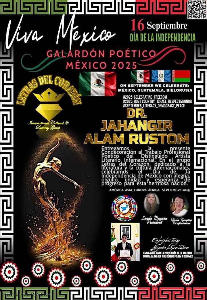 বাংলাদেশের গর্ব, বিশ্বসেরা কবি ও পরিবেশ বিজ্ঞানী ড. জাহাঙ্গীর আলম রুস্তম অর্জন করেছেন মর্যাদাপূর্ণ মেক্সিকো স্বাধীনতা পুরস্কার ২০২৫। চলতি বছরের আয়োজিত বিশেষ সম্মাননা অনুষ্ঠানে বিশ্বের গুণীজন ও স্বনামধন্য ব্যক্তিবর্গের সঙ্গে এই পুরস্কারে ভূষিত করা হয় তাকে।