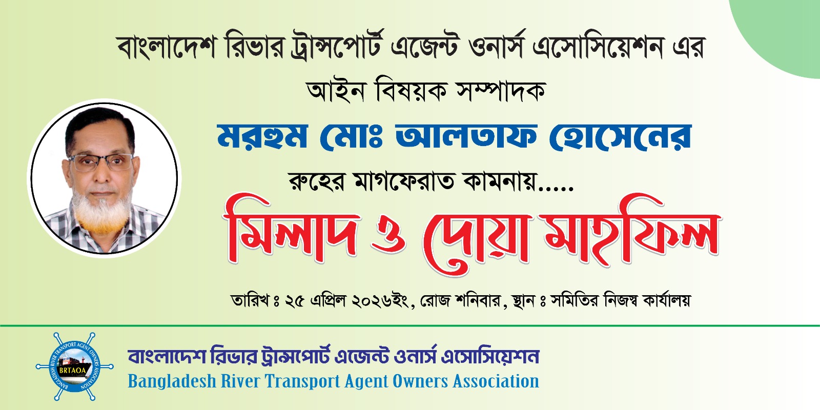 রাশেদ কবীর: বাংলাদেশ রিভার ট্রান্সপোর্ট এজেন্ট ওনার্স এসোসিয়েশনের আইন বিষয়ক সম্পাদক মরহুম মোঃ আলতাফ হোসেনের রুহের মাগফেরাত কামনায় এক মিলাদ ও দোয়া মাহফিল অনুষ্ঠিত হয়েছে। আজ (শনিবার) এসোসিয়েশনের নিজস্ব কার্যালয়ে এই বিশেষ সভার আয়োজন করা হয়।